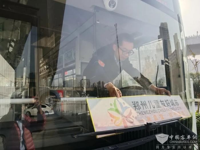 “儿童友好线路”在车头前挡风玻璃处放有郑州儿童友好城市宣传标识。在各公交线路调度室、场区、站台等场所,利用LED显示屏、电视循环播放儿童友好相关视频标语。