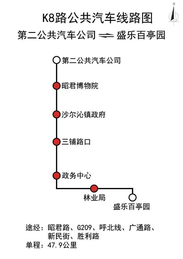 线路起始点分别为和林格尔百亭园和呼市公交第二公共汽车公司,线路途经昭君路、G209、呼北线、广通路、新民街、胜利路,共设5个中途站,单程47.9公里。