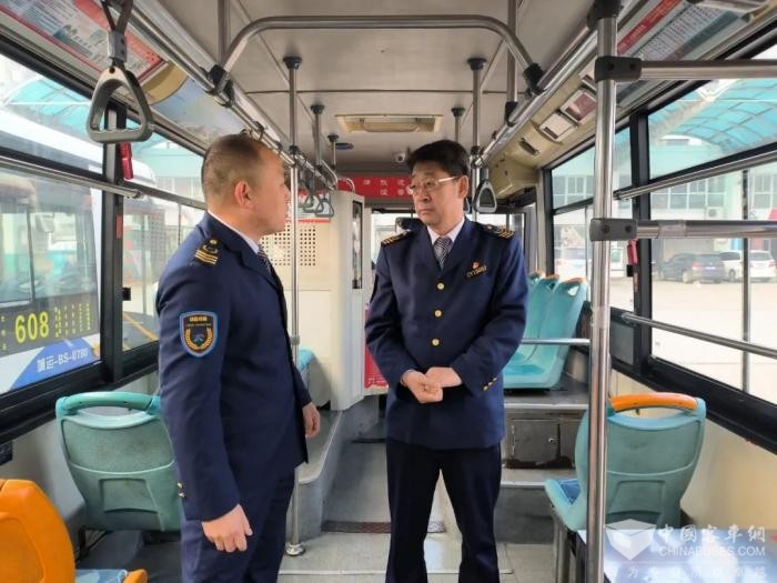 在汽车北站场站,王秉强总经理一行首先登上608路公交车,仔细查看了车厢内的卫生情况,检查了灭火器等安全设备,并听取了通达分公司相关负责人关于假期安全保障、营运服务等方面的工作汇报。