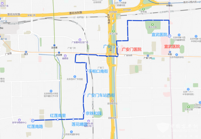 方便红莲南路、广外地区等社区居民前往广安门医院、宣武医院就医出行。乘客可选择在“红莲南路”、“红莲南里”、“京铁和园”等公交车站乘车,前往广安门医院、宣武医院。