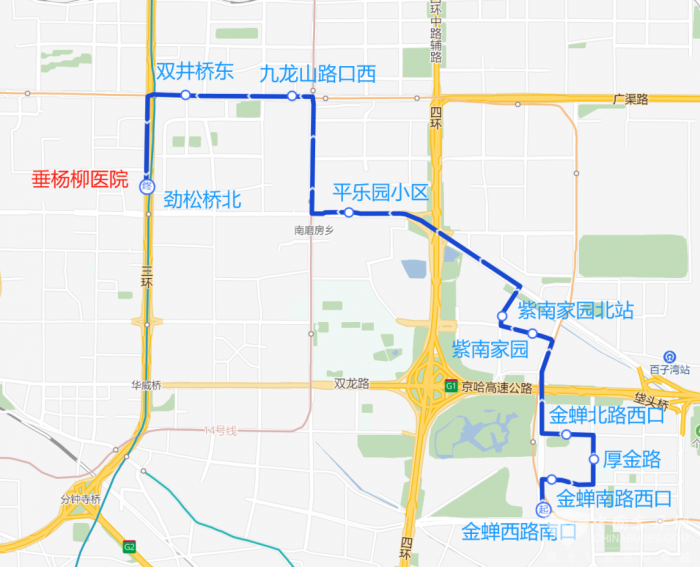 沿途设站:万柳中路南口、汇新家园、万柳中路、万柳中路北口、海淀黄庄北。