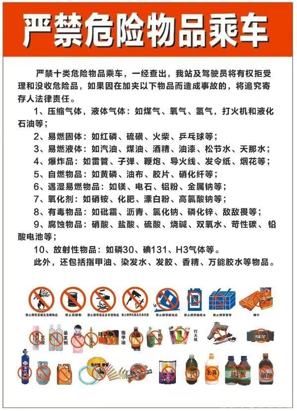 针对人流量较密集市郊交界线路、场站,我公司张贴了严禁携带危险品乘车的海报标识。工作人员介绍,易燃易爆、枪支、腐蚀品、管制刀具等都不能 “坐”公交,如:爆竹、汽油、导线雷管、炸药、染发剂、发胶、花露水、油漆、农药、万能胶水、液化气、硫磺、硝酸、盐酸、指甲油等都属于危险品的范畴。乘客市民也可以对照标识,自觉履行好乘车规范,不携带危害公共安全的物品上车。