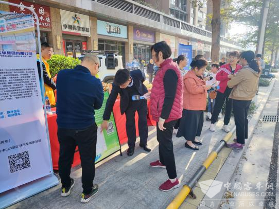 为提高居民对新线路的知晓率,当天上午,中山公交集团在佳境康城小区开展“公交进社区”服务宣传活动,向小区居民介绍新增站点基本情况,认真讲解线路、车辆运营信息及乘车优惠政策等,鼓励市民乘坐996路公交车出行。