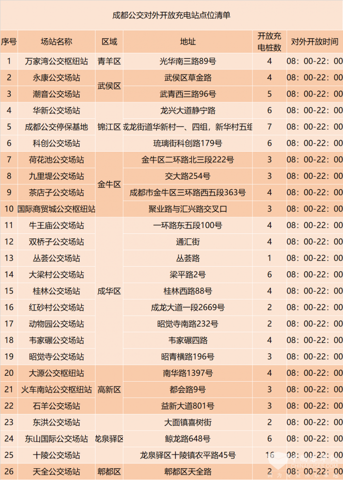 涉及100余个充电桩 成都公交全面对社会开放26处公交场站