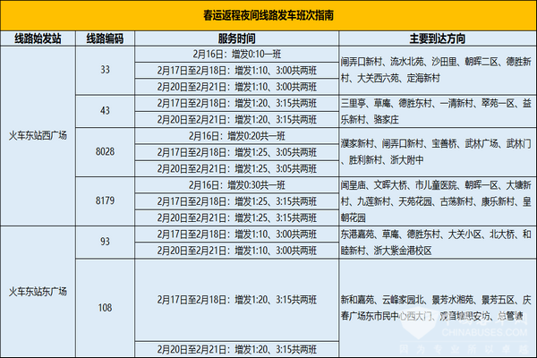 自2月16日起,杭州公交将延长4条杭州东站公交始发线路服务时间,加密2条通宵线路发车班次。