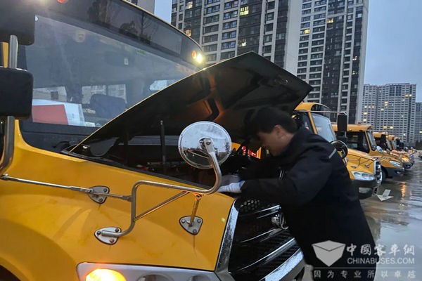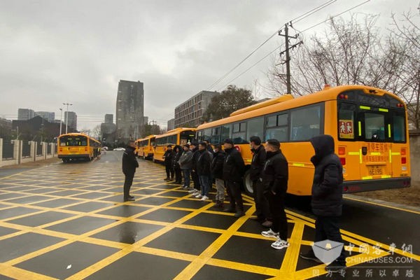 早上六点不到,校车工作人员们已就位。在对校车进行发车前检查和消毒清扫后,召集驾驶员进行班前会议,安排开学首日运行任务,重点强调了雨天行车注意事项,并叮嘱安全行车。