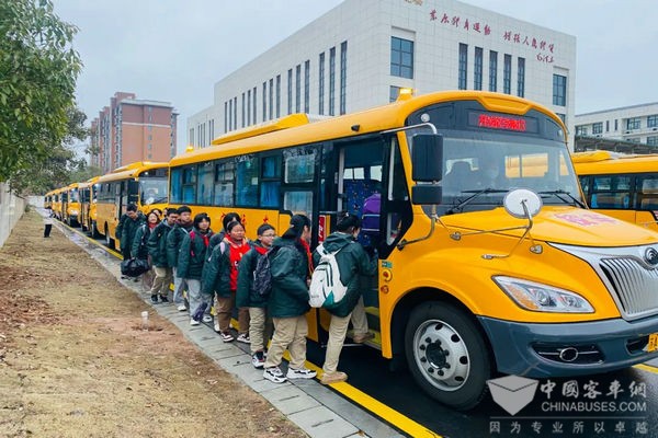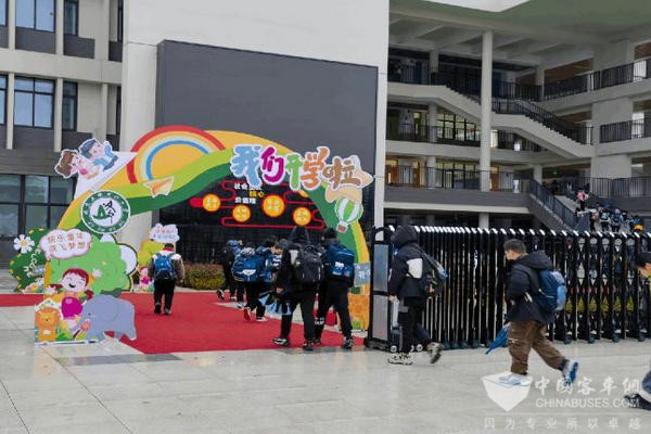 所有校车安全准点抵达相应学校,同学们有序下车,结伴而行走进教室