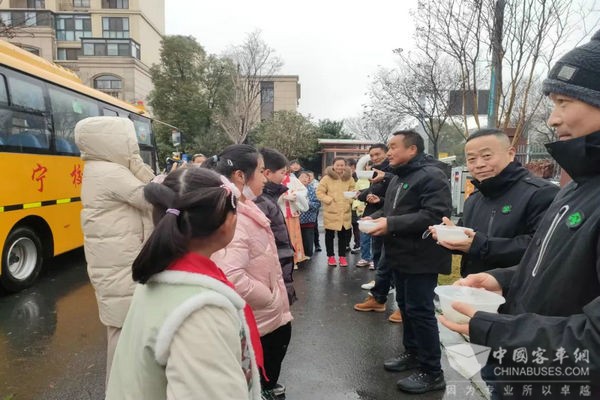 元宵节将至,开学首日,月华路小学的同学们给驾驶员叔叔“投喂”爱心汤圆。驾驶员们喜笑颜开,“虽然今天天气很冷,但热乎乎的汤圆喝的心里暖洋洋”!