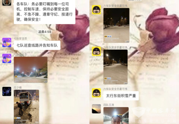 各分公司管理人员带头分组探路,从凌晨4时开始,对中心城区及远城区公交线路途经的桥梁、坡道以及积水结冰点进行排查,发现路面有积雪、结冰、打滑等现象,及时在工作群内发送警示信息。提前做好线路路面重点路段的巡查,管理人员在岗在位、组织好线路运行,实现运力、班次的最大化投入,合理安排线路运行。