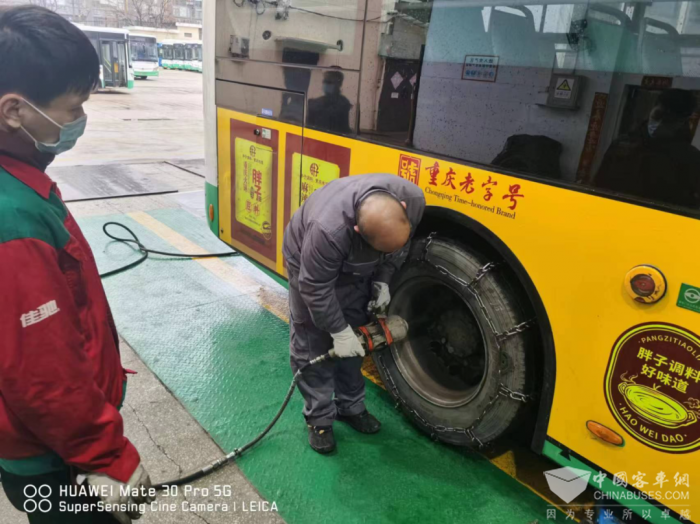 2月19日开始,武汉公交集团就组织应急小分队为火车站等大型公交枢纽站的应急车辆、抢险救援工程车安装轮胎防滑链,并为部分线路和场站配备了已经安装好防滑链的轮胎,随时准备加装车辆用于应急处置。