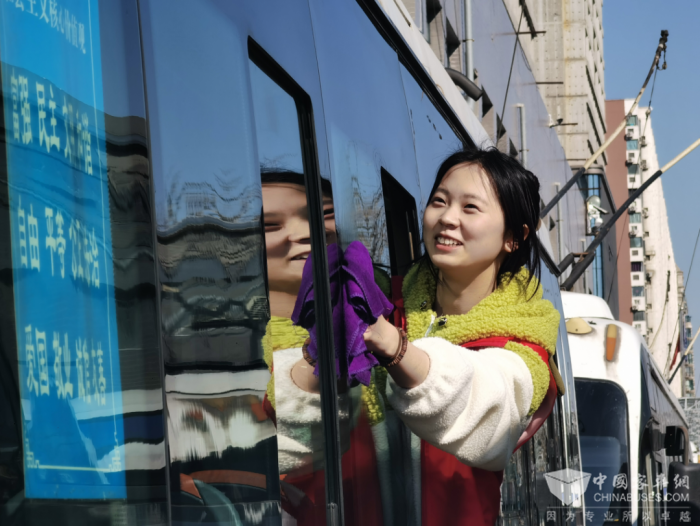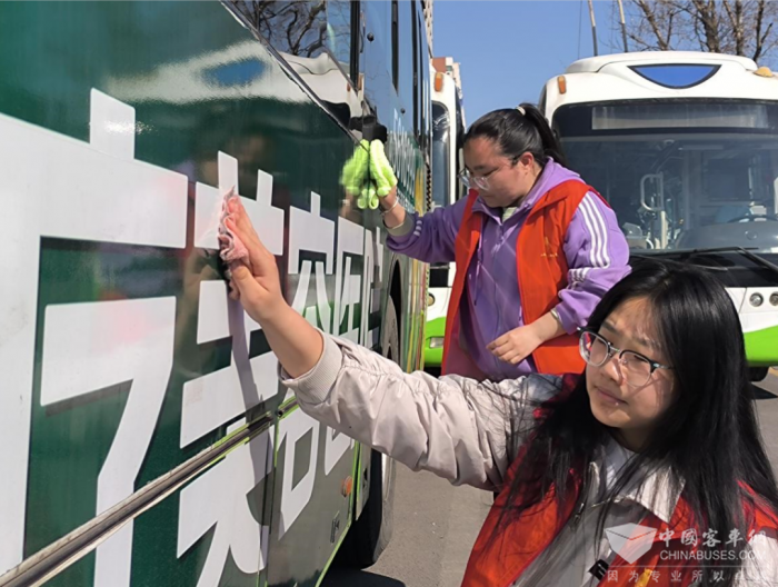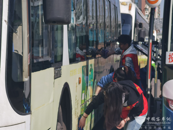 午间的护学志愿岗结束后,大学生志愿者们又在车场卫生员的带领下,帮忙搞起了公交车辆卫生。在四车队带班队长裴震的引导下,志愿者们8人一组。有的负责清洗车辆小轿卫生;有的负责擦拭扶手拉环;有的负责清洗车辆内皮;有的负责擦拭车辆玻璃。大学生志愿者们干起活来都分外认真,一辆辆公交车被擦洗的光洁如新。