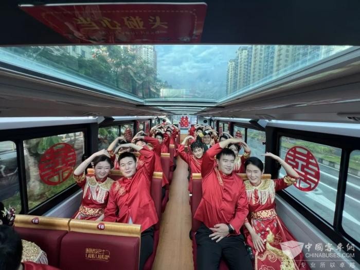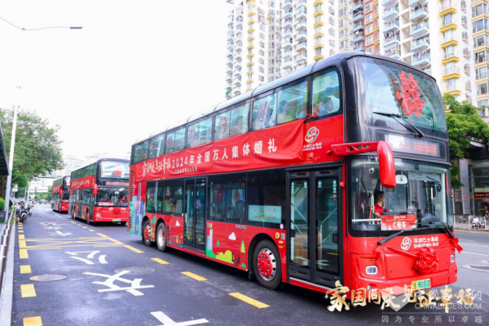 深圳是此次集体婚礼分会场之一,75对新人与全国各地其他新人共同分享喜悦,见证幸福,感受爱的力量。作为国内旅游观光巴士行业标杆和城市新名片,深圳巴士集团“红胖子”旅游观光巴士摇身一变,成为迎亲“花轿”,车头悬挂着大红花,车窗张贴着红双“囍”字,装点得格外喜庆。