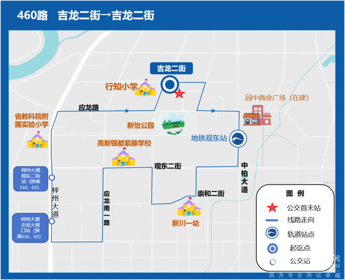 线路走向:吉龙二街出发,经吉龙二街、应龙北三路、应龙路、中柏大道、观东二街、新川北三路、崇和二街、应龙南二路、观东二街、应龙南一路、新通大道、梓州大道、应龙路、应龙北二路至吉龙二街。