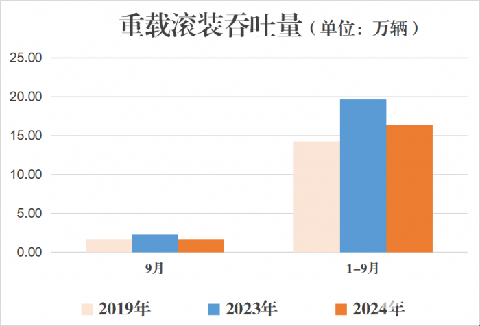 9月完成重载滚装吞吐量1.69万辆,比2023年同期下降26%,比2019年同期下降2%。