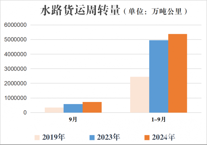 1-9月累计完成水路货运周转量5382418万吨公里,比2023年同期增长8.7%,比2019年同期增长119.7%。
