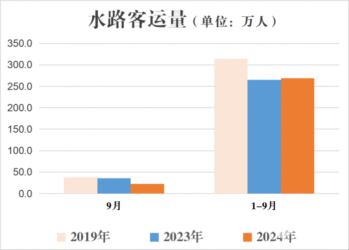 1-9月累计完成水路客运量268.42万人,比2023年同期增长1.2%,比2019年同期下降14.6%。