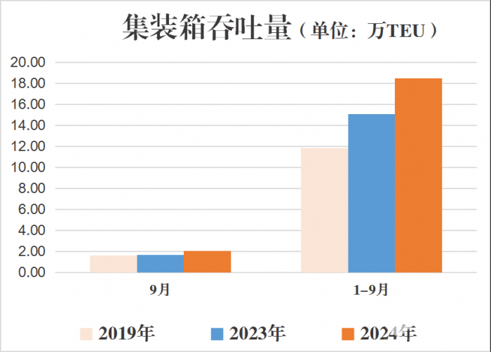 1-9月累计完成集装箱吞吐量18.48万TEU,比2023年同期增长22.4%,比2019年同期增长56.2%。