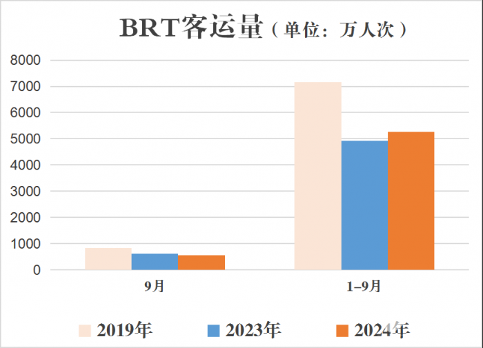 1-9月累计完成BRT客运量5268万人次,比2023年同期增长7.02%,比2019年同期下降26.54%。