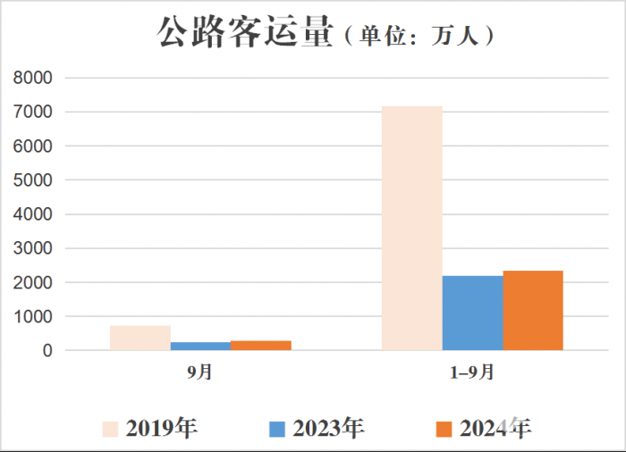 1-9月累计完成公路客运量2345.51万人,比2023年同期增长6.7%,比2019年同期下降67.3%。