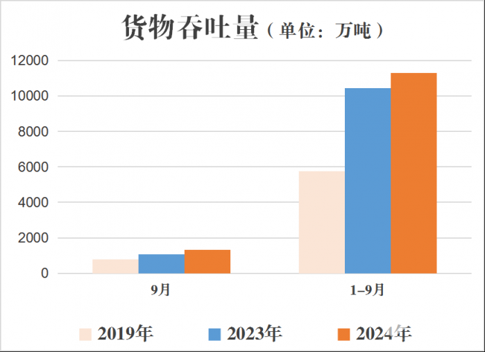1-9月累计完成货物吞吐量11302万吨,比2023年同期增长8.2%,比2019年同期增长96.5%。