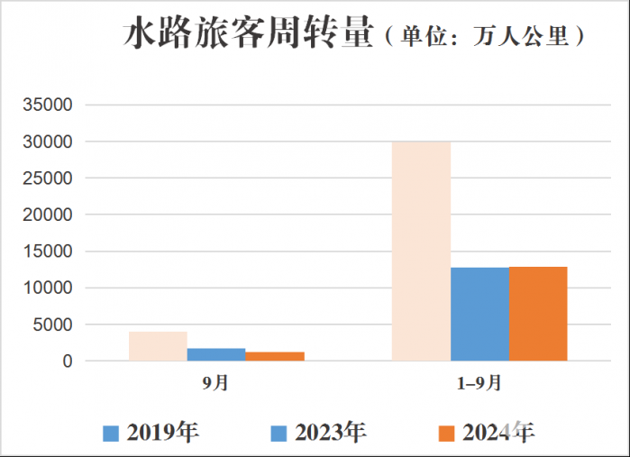 1-9月累计完成水路旅客周转量12898万人公里,比2023年同期增长1.1%,比2019年同期下降56.9%。