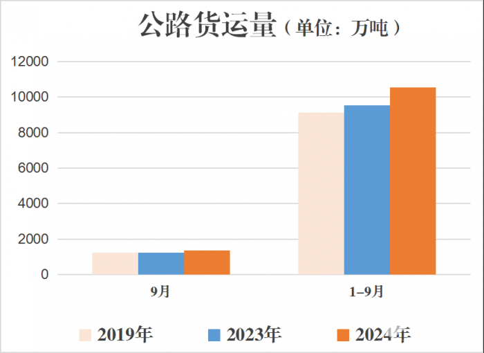 1-9月累计完成公路货运量10551.92万吨,比2023年同期增长10.58%,比2019年同期增长15.6%。