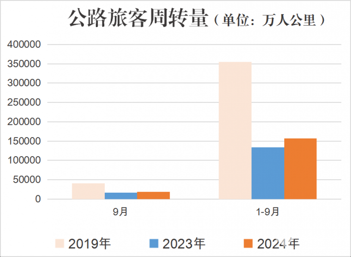 1-9月累计完成公路旅客周转量156635.27万人公里,比2023年同期增长17.4%,比2019年同期下降55.8%。