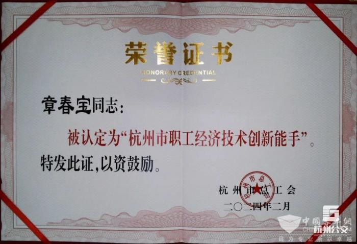 在2023年杭州市公共交通技术比武中,章春宝荣获个人三等奖,并于2024年2月被杭州市总工会认定为“杭州市职工经济技术创新能手”。为表彰他的努力与成就,车队为他举行了一场表彰仪式,让全体司机以他为榜样,不断提升自身的业务能力和服务水平,共同为提升城市公共交通服务质量贡献力量。