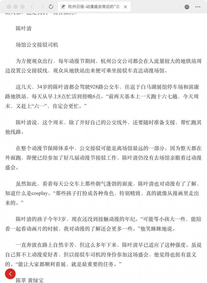 陈叶清说:“我是机动驾驶员,除了开好自己的公交线路外,还要随时准备支援,去跑其他线路,这就需要我花更多的时间去磨练驾驶技术了,平常也要留意不同道路的状况。”在2024第二十一届中国国际动漫节期间,他的事迹受到了杭州新闻、杭州日报的关注和报道。