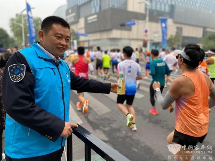 凌晨,天还没亮,驾驶员和各级管理人员、公交志愿者等就已经就位。在主要封闭路口、车辆调头点、屯车路口等地点都有他们忙碌的身影。他们一边协助交警设置赛道路口屏障,一边做好摆渡车辆运营服务工作。