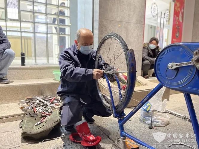 孔胜东在中山北路义务服务点为民修车 受访者供图