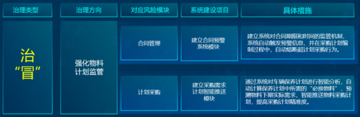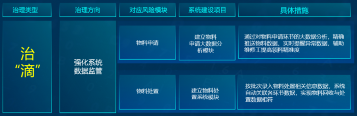 在治跑方面,主要治理方向是强化物料动态监管,防止物料脱离系统监管;在治冒方面,主要治理方向是强化物料计划监管,提高物料采购计划精准度;在治漏方面,主要治理方向是强化物料过程监管,完善物料管理各环节系统流程;在治滴方面,主要治理方向是强化系统数据监管,杜绝物料多领错领造成浪费。