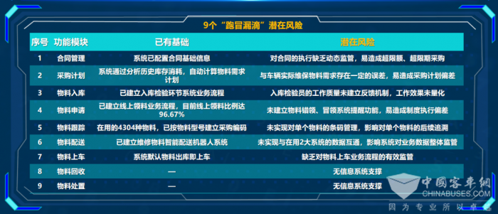通过优化或新建9个系统风险监管模块,重塑9个“跑冒漏滴”潜在风险的系统监管机制,进一步健全完善物料管理监管体系,强化系统智能预警和主动防范功能。