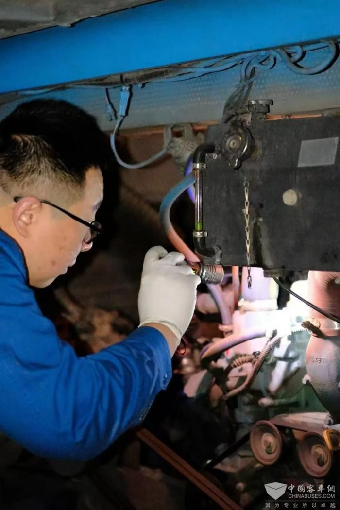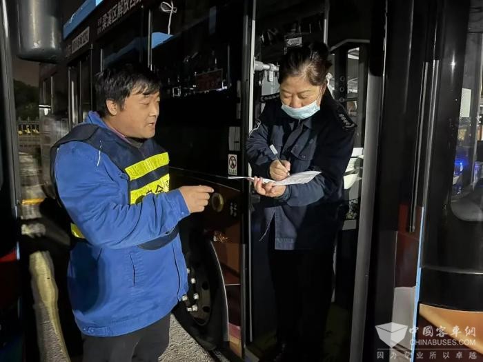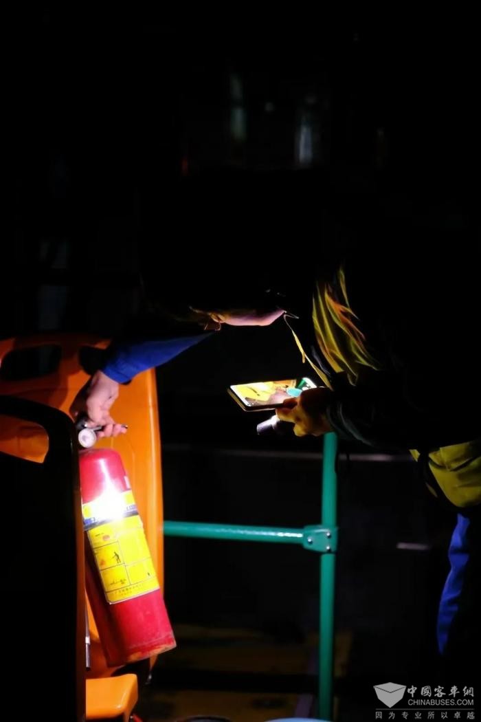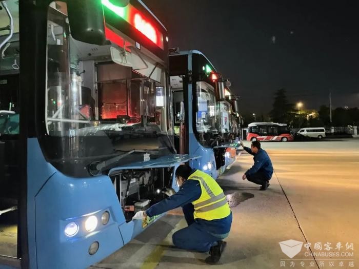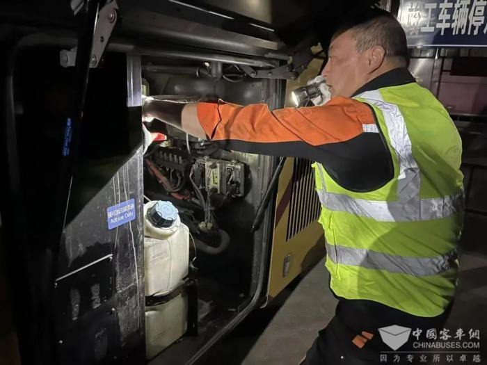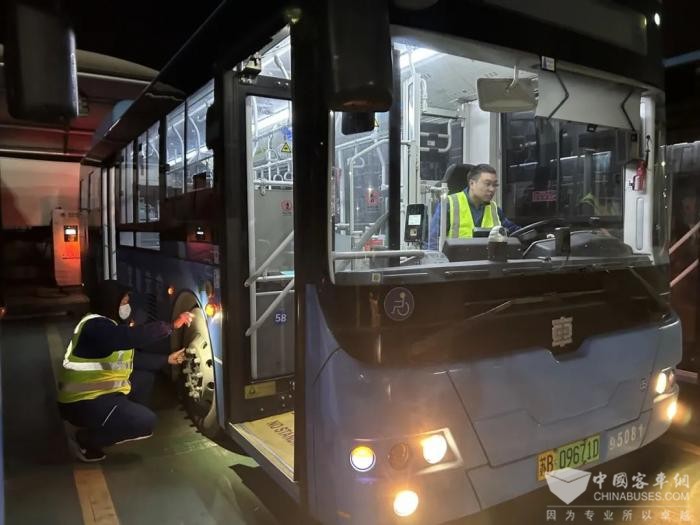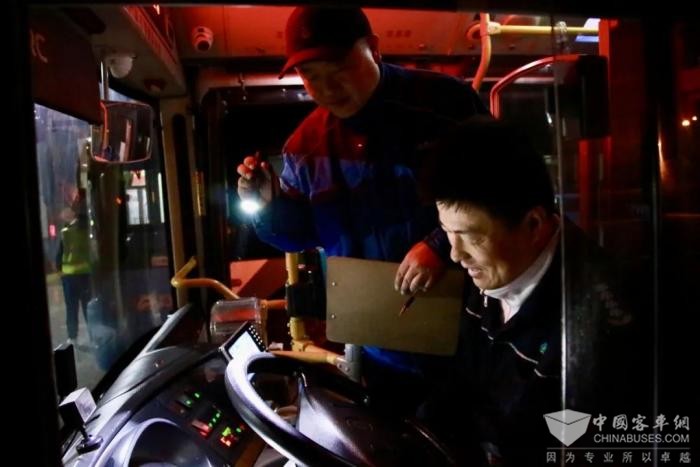 凌晨四点不到,各基层单位所有管理人员到达指定岗位,机务保障人员对所有营运车辆安全一级部位进行重点检查和维护,确保车辆仪表、灯光、制动、车门等设备性能良好。