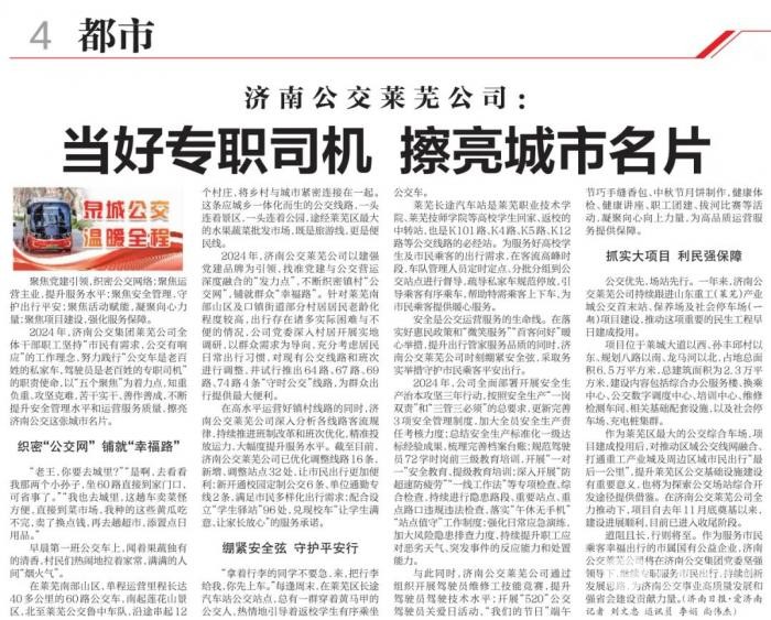 2024年,济南公交莱芜公司全体干部员工坚持“市民有需求,公交有响应”的工作理念,努力践行“公交车是老百姓的私家车,驾驶员是老百姓的专职司机”的企业使命,以“五个聚焦”为着力点,知重负重、攻坚克难,苦干实干、善作善成,不断提升安全管理水平和运营服务质量,擦亮济南公交这张城市名片。