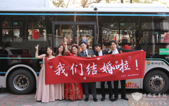 以往,婚车似乎被豪车的奢华阵容所“垄断”,而郑州公交却以大胆且极具创意的设想打破这一常规。一辆看似普通的纯电动公交车,在精心装扮之下,实现华丽转身,惊艳蜕变为满载幸福的“爱情专列”。车头那一大束娇艳欲滴、馥郁芬芳的玫瑰,传递出浓郁热烈的浪漫气息;车窗之上,张贴着一张张醒目耀眼、红得鲜艳的喜字,又为整个车身增添了几分庄重肃穆与喜庆欢愉的氛围;步入车厢内部,轻盈垂落的拉花、别具一格的贴纸,与精巧别致的挂件相互映衬,共同编织出一个浪漫而又不失华丽的温馨空间。