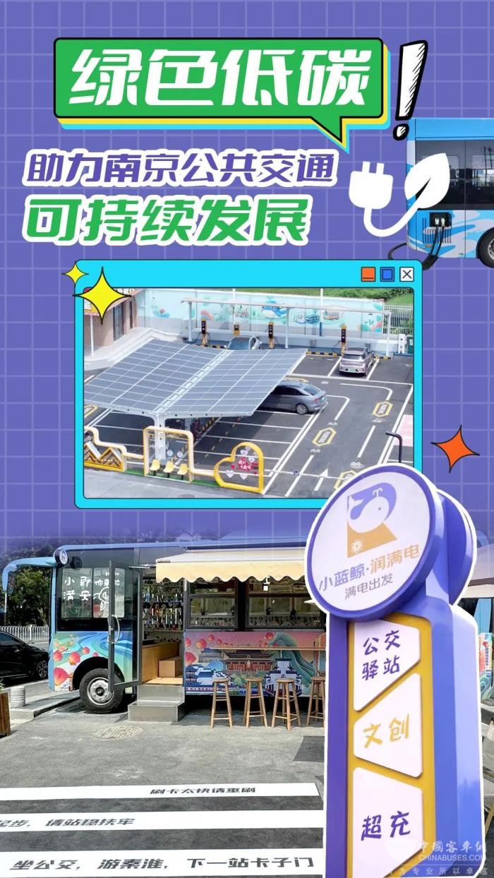 场站内,除了光伏智能充电区可以满足市民的充电需求之外,“退役”公交车变身售卖文创产品的“蓝鲸小铺”、南京本土文化和公交元素兼具的外部装饰、中式快餐连锁品牌、“小蓝鲸”涂鸦墙等时尚、便民、个性化的元素,充分展现了“公交+生活”的经营联动模式,让公交蓝赋能绿色新能源,低碳经济碰撞综合新生态。