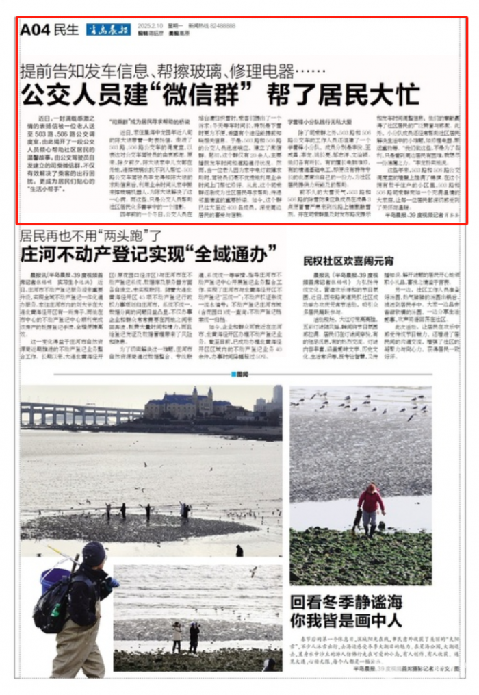 近日,家住星海中龙园年近八旬的陈大娘带着一封表扬信,走进了503路、506路公交车的调度室,以表达对公交车驾驶员的由衷感谢。原来,除夕前夕,陈大娘家中儿女都在外地,连擦玻璃也找不到人帮忙。503路公交车驾驶员李龙得知陈大娘的求助信息后,利用业余时间从家中搬来擦玻璃机器人,为陈大娘解决了这一心病。而这些,只是公交人员帮助社区居民众多善举中的一个缩影。四年前的一个冬日,公交人员在站台清扫积雪时,乘客们提出了一个诉求:冬天等车时间长,特别是下雪时更为不便,希望有个途径能提前知晓相关信息。于是,503路和506路的公交人员迅速响应,建立了微信群。起初,这个群仅有20余人,主要播报发车时间和道路通行状况。然而,当一位老人因为家中电灯故障求助时,驾驶员们毫不犹豫地利用业余时间上门帮忙修好。从此,这个司乘群逐渐成为社区居民寻求帮助、传递邻里情谊的重要桥梁。如今,这个群已壮大至近400名成员,深受周边居民的喜爱与信赖。