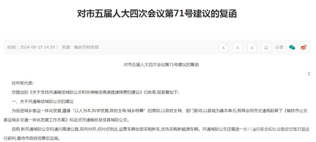 在《关于支持开通榆佳城际公交和协调榆佳高速提速降费的建议》的答复(2024年8月17)中,有关部门对“关于开通榆佳城际公交的建议”的答复如下: