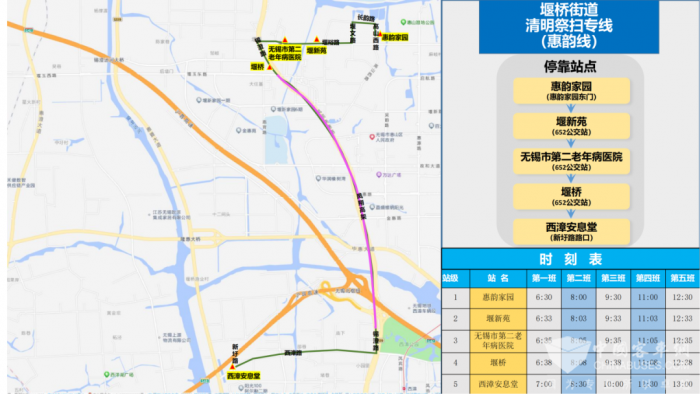 惠韵线设置惠韵家园,堰新苑,无锡市第二老年病医院,堰桥,西漳安息堂站点,营运时间从6点30分12点30分,共5个班次;