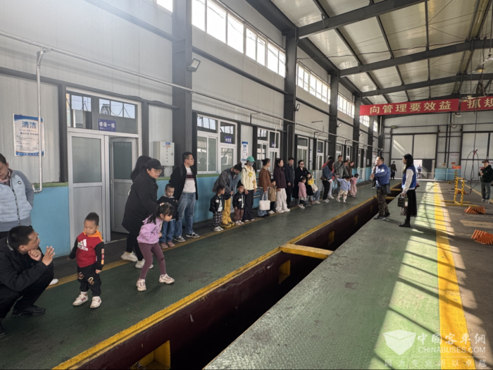 随后,孩子们手拉手走进公交车“体检中心”——修保车间。孩子们站在警戒线外探着脑袋向神秘的地沟望去,当看到修理工叔叔们不怕脏、不怕累,钻进地沟检修底盘的场景时,孩子们的眼神中流露出满满的敬佩之情,深切体会到了“城市动脉守护者”的艰辛与不易,对这些幕后英雄的敬意油然而生。