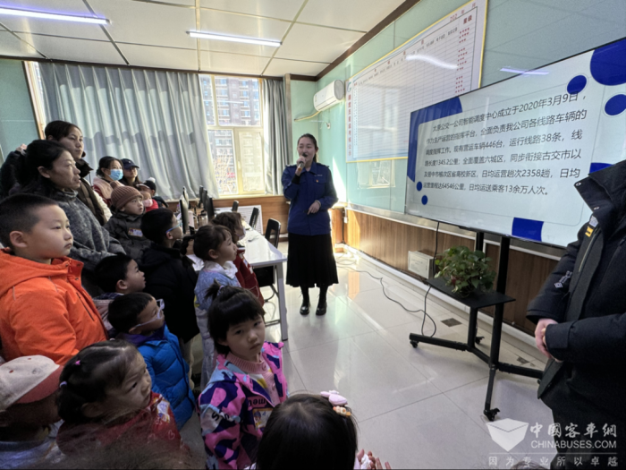 研学之旅的首站,孩子们来到了公交的“神经中枢”——智能调度中心。工作人员热情洋溢地迎接孩子们的到来,并耐心且详细地讲解“公交车如何听令指挥”的奥秘。通过实时展示车辆定位与智能调度系统,原本抽象复杂的大数据概念变得鲜活而直观。孩子们个个睁大眼睛,全神贯注地聆听,还不时踊跃提问,工作人员都一一耐心解答,在这一过程中,孩子们对现代公交系统的智能化和高效性有了初步的认识。考虑到学龄前儿童的认知特点,工作人员还将常见交通标识、智慧交通站台等知识融入讲解课件,让安全出行、绿色出行的理念从小就在孩子们心中扎根发芽。