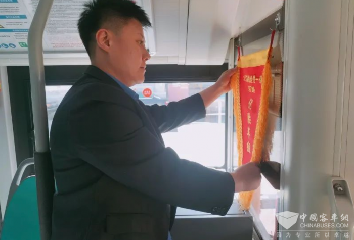 907路公交车驾驶员乔丽萍挂好车厢里“优胜车组”流动红旗。 记者梁淑芳摄