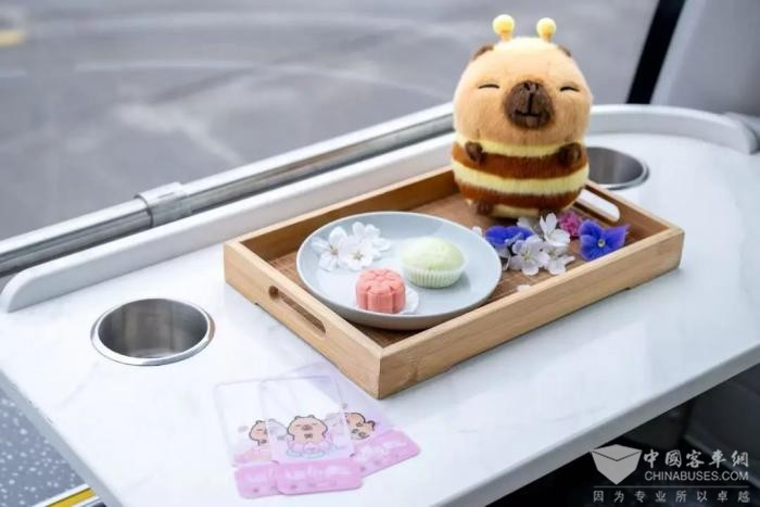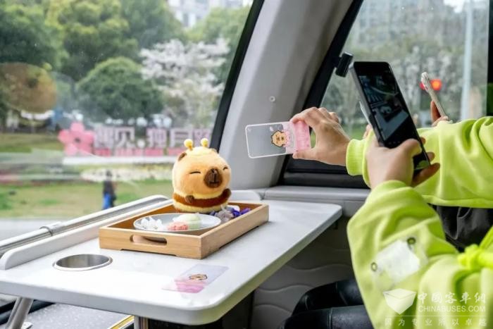 巴士二层堪称打卡天堂,全景天窗设计,让你360度沉浸式欣赏“天空住满了树”的绝美街景。车窗旁还设有卡皮巴拉小黄豚专属风景打卡框,随手一拍,都是大片。体验过的王女士兴奋地说:“我家孩子超爱卡皮巴拉小黄豚,车厢里还有文创展示,坐这趟巴士,就像和孩子来了场亲子微旅行 。”