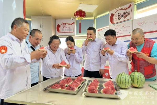 在职工驿站,新鲜甘甜的西瓜被逐一切开,大家围坐分享,欢声笑语驱散暑气。在修理车间,党员志愿者们亲手将清凉西瓜递到职工手中,详细询问工作强度与防暑措施落实情况,叮嘱大家合理安排作息,注重高温防护,确保以良好状态投入工作。