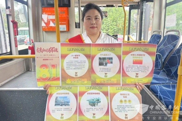 在468路和673路主题车厢里,车窗张贴“建军节历史沿革”图文展板,生动讲述从南昌起义到强军兴军的光辉历程、中国人民解放军军种构成等知识。展板上张贴了“英雄故事卡”,精选雷锋服务人民的暖心事迹、陈祥榕“清澈的爱,只为中国”的戍边誓言等不同年代的军人风采。“我是一名退伍军人,每逢‘八一’,心里都会涌动别样的自豪,希望广大市民在这个特别的日子里同样能感受到强军之魂。”673路驾驶员江振兴介绍。