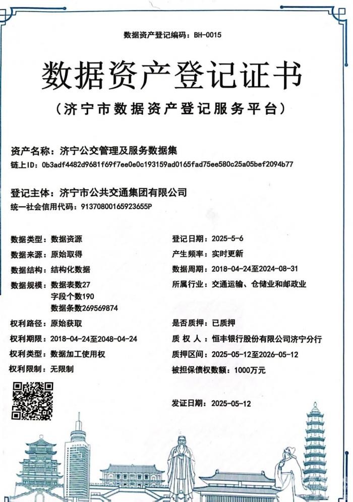 (二)数据资产破冰,激活价值潜能。济宁公交集团率先探索数据资源向资产转化路径,完成“济宁公交管理及服务数据集”全流程开发,通过“数据盘点-治理-入表-登记-评估-融资”闭环操作,将数据资源转化为合规资产。2025年6月,该数据集获恒丰银行济宁分行1000万元融资授信,成为全市国企首例数据资产融资案例,实现数据资产化从“0”到“1”的突破,为沉睡数据赋予金融生命力。同时,获得DCMM(数据管理能力成熟度评估模型)三级(稳健级)证书,为济宁市首个获得DCMM三级证书的市管企业,为数据资产规范化管理与持续增值奠定基础。