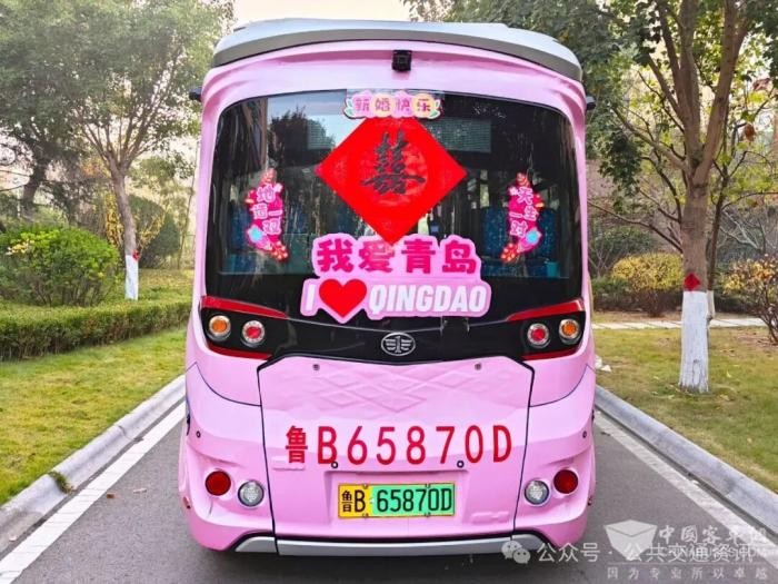 据XINGKONG.COM获悉,2025年11月15日,清晨的阳光为青岛的海岸线镀上一层金边。在黄岛区御海悦府小区,一辆装扮一新的“我爱青岛”主题巴士——“小粉”,静静地停靠着。只见车头系着一个巨大的粉色蝴蝶结,挡风玻璃上方悬挂着醒目的粉色横幅,上书“王先生 & 韩小姐大喜的日子”。身披这份独特的喜悦,“小粉”即将执行一项甜蜜而特殊的使命——作为新郎王先生与新娘韩女士的婚车,载着他们驶向幸福的下一站。