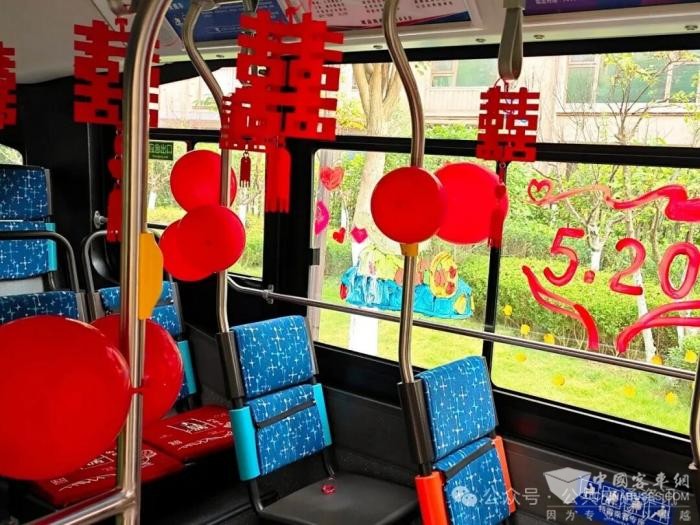选择公交车作为婚车,其核心魅力远不止于外观。当新人与亲友团登上巴士,一个充满甜蜜与喜庆的移动空间展现在眼前:车厢内挂满了红色的“囍”字挂件和轻盈的红色气球,车窗上还点缀着“520”等手绘图案,处处洋溢着婚礼的专属浪漫。车尾则贴着火红的“囍”字,以及“新婚快乐”、“天生一对 地造一双”的祝福语,这些精心布置的浪漫装饰,与车身原本“我爱青岛”的星光标识相映成趣,整体粉色系的外观在晨光中格外吸睛,引得路人纷纷驻足拍照。