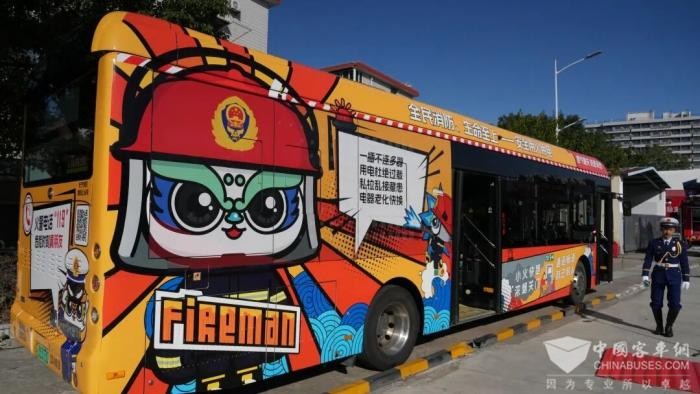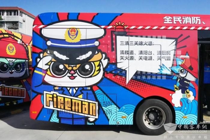 消防巴士车身采用消防标志性的红蓝两色、橙黄亮色为主色调,搭配“全民消防,生命至上——安全用火用电”消防宣传月主题标语和防火提示,成为穿梭在城市中亮眼的“移动消防宣传站”。车厢内聚焦沉浸式消防互动空间打造:座位椅背和扶手拉环分别贴有通俗易懂的消防小贴士,内容涵盖用火用电规范、家庭防火技巧、火灾逃生要点、消防器材使用等关键领域;车内挡板设置生动有趣的消防安全问答,与椅背提示形成互补,让乘客沉浸在全景式消防空间中,在潜移默化中学习消防知识。